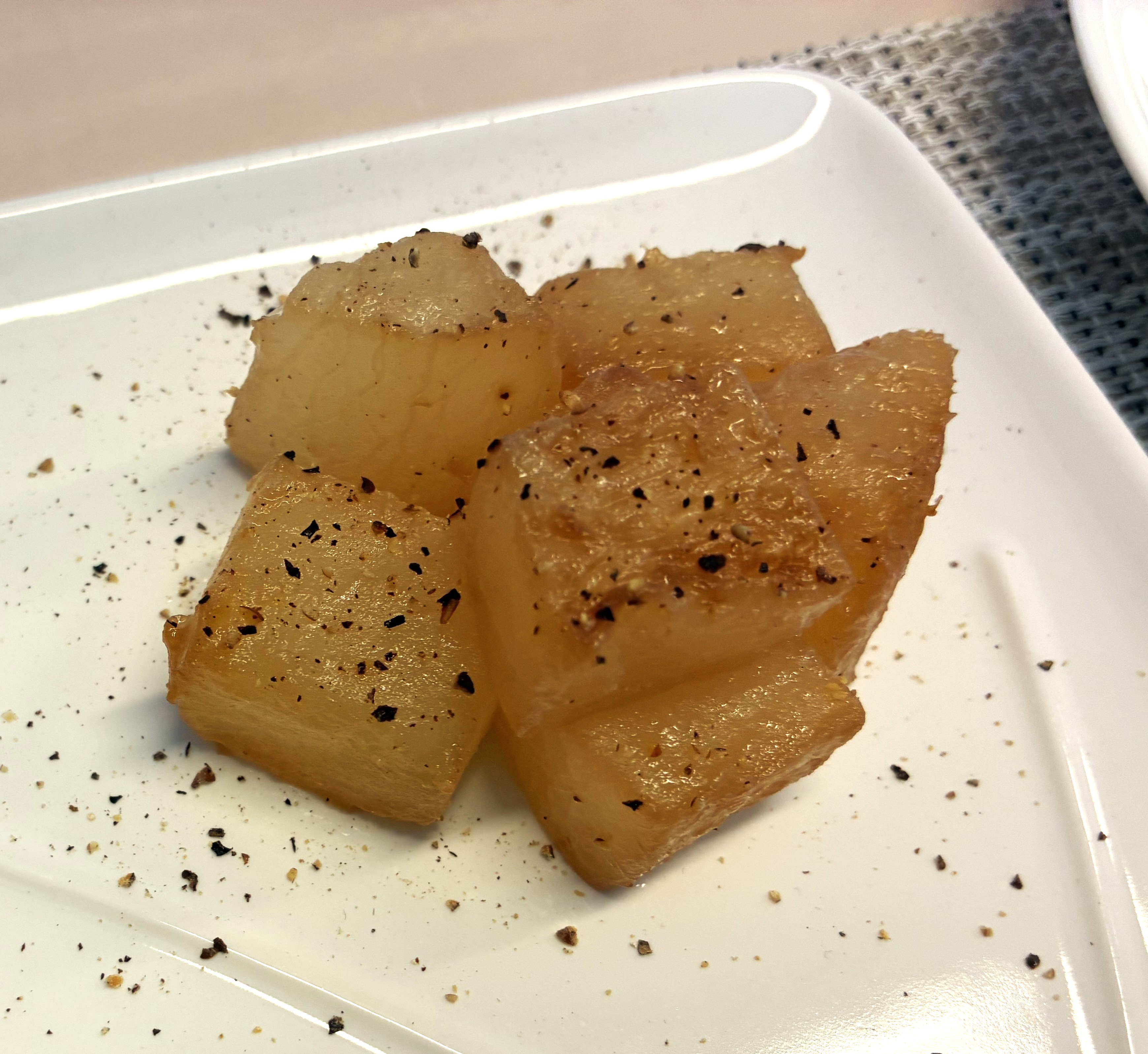 大根の美味しい時期なのでステーキにしました。最初に大根を茹でて、その後少量のバターと醤油、酒で味付けします。バターの濃くと醤油の風味で美味しくいただけです。ゆで汁は大根のうま味がしっかり出ていますので、ぜひスープなどに使ってくださいね。