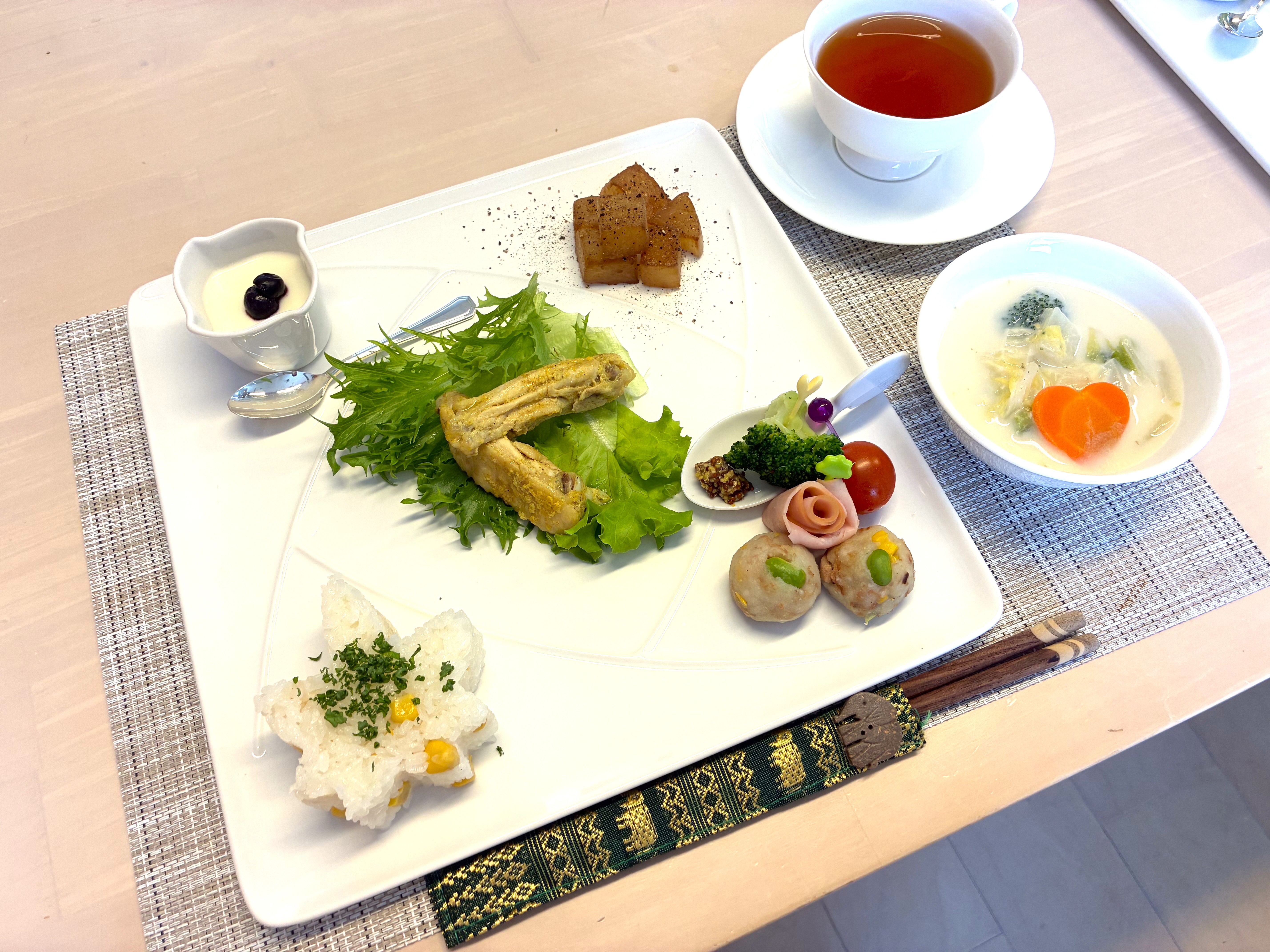 (おかず・デザートのみ 294kcal・炭水化物24.6g・たんぱく質19.5g・脂質15.3g・塩分2.6g)※ご飯は各自の指示エネルギーに合わせてついでもらいました。