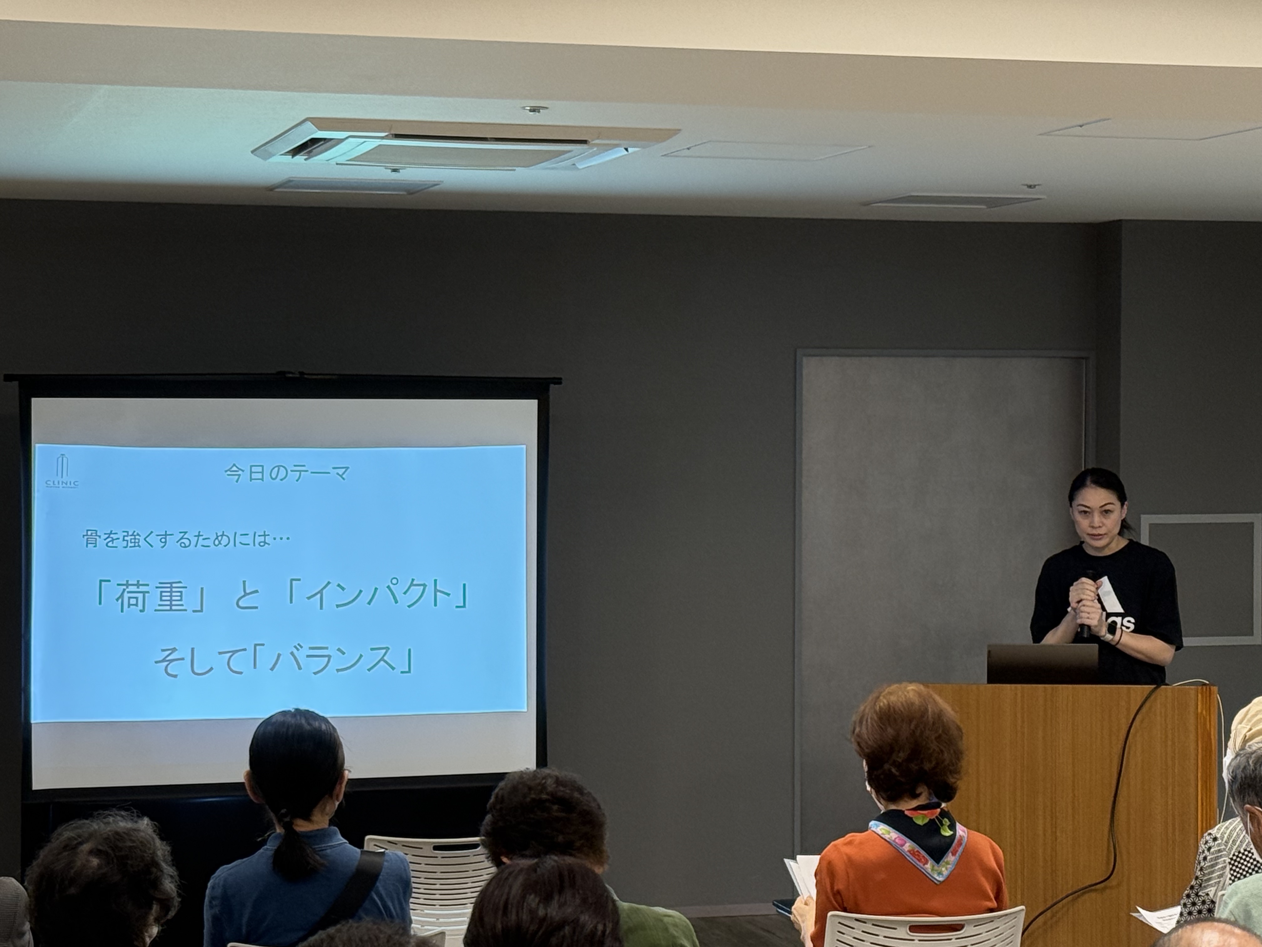 当院の健康運動指導士の守田さんからは、実際に身体を動かしながら骨を守る運動の実践を。